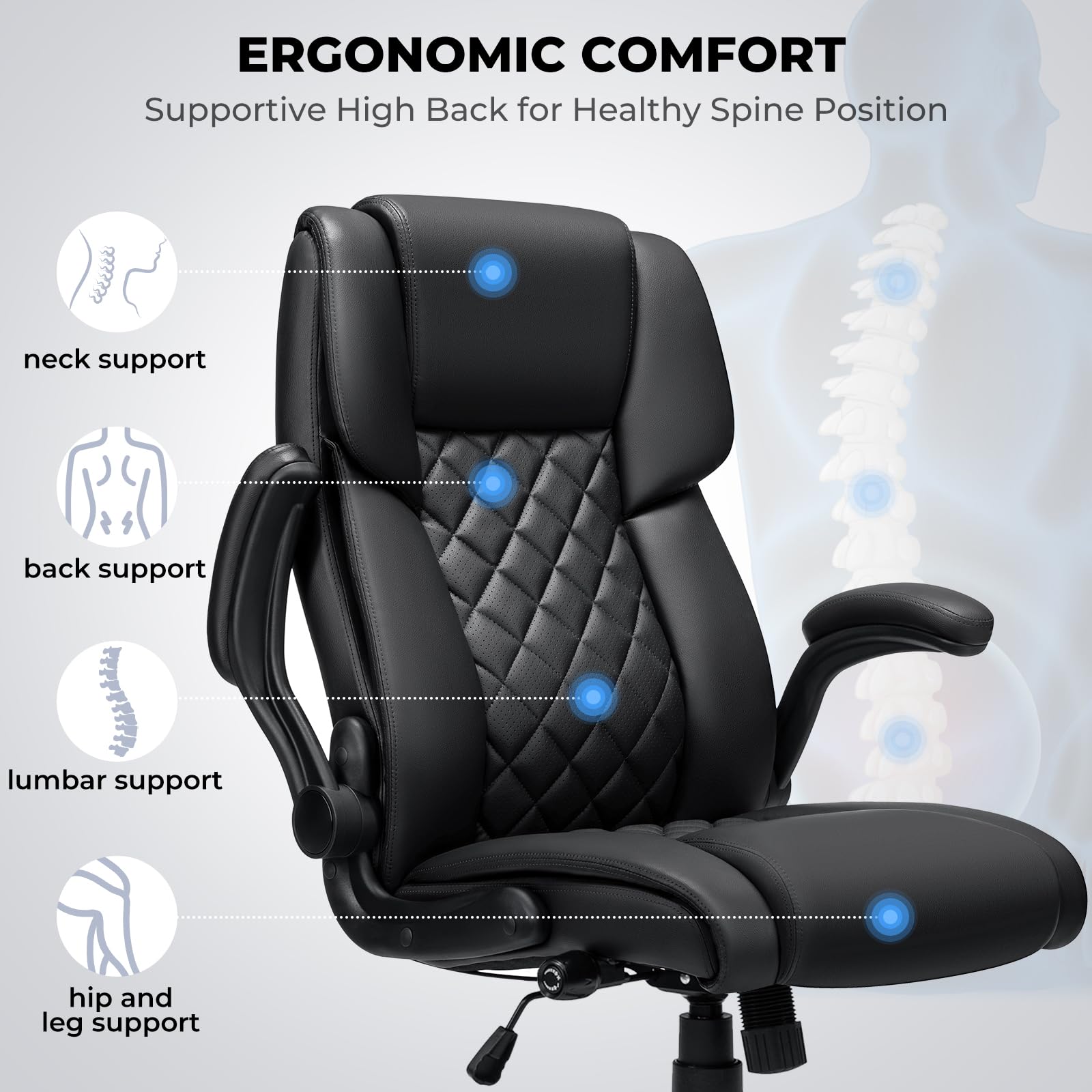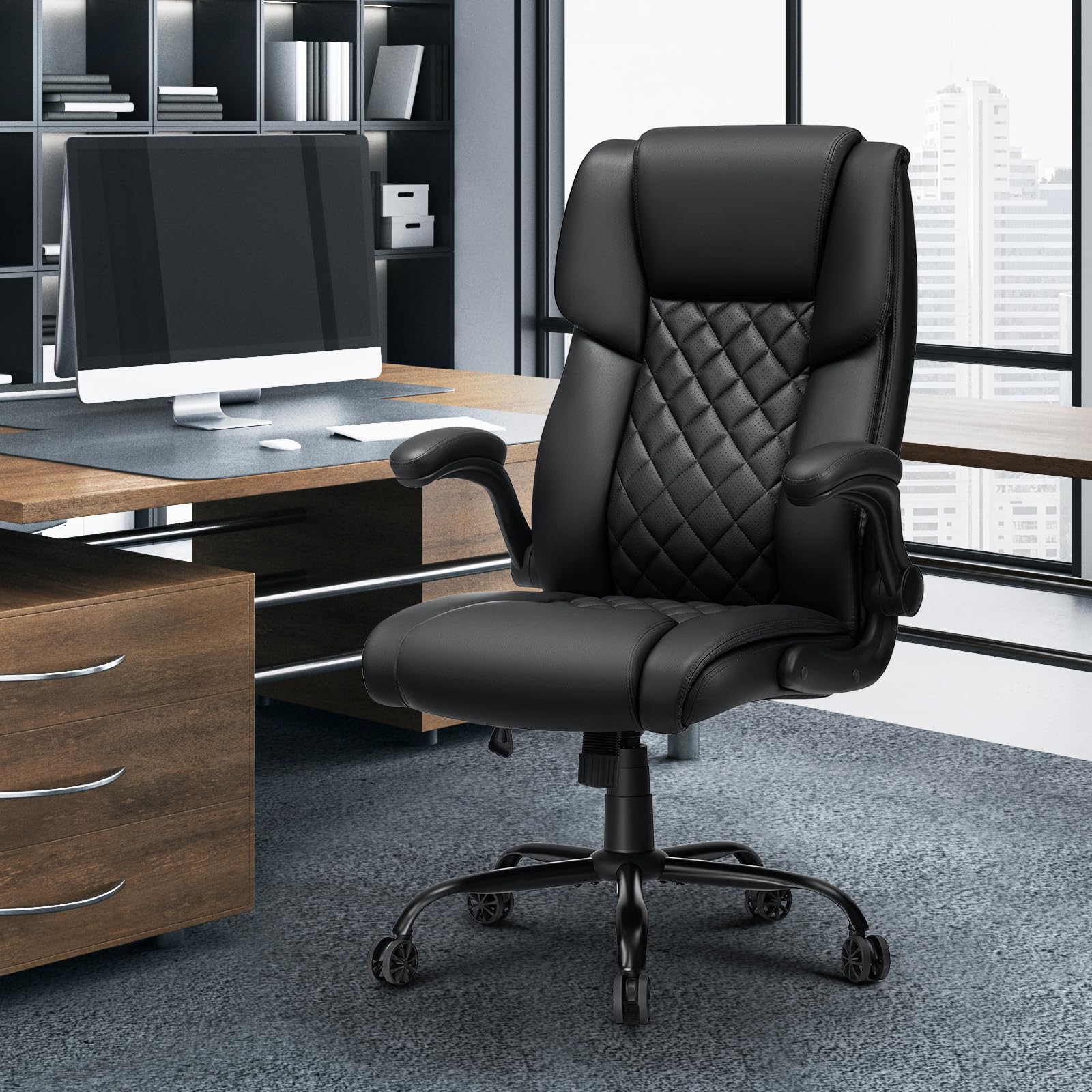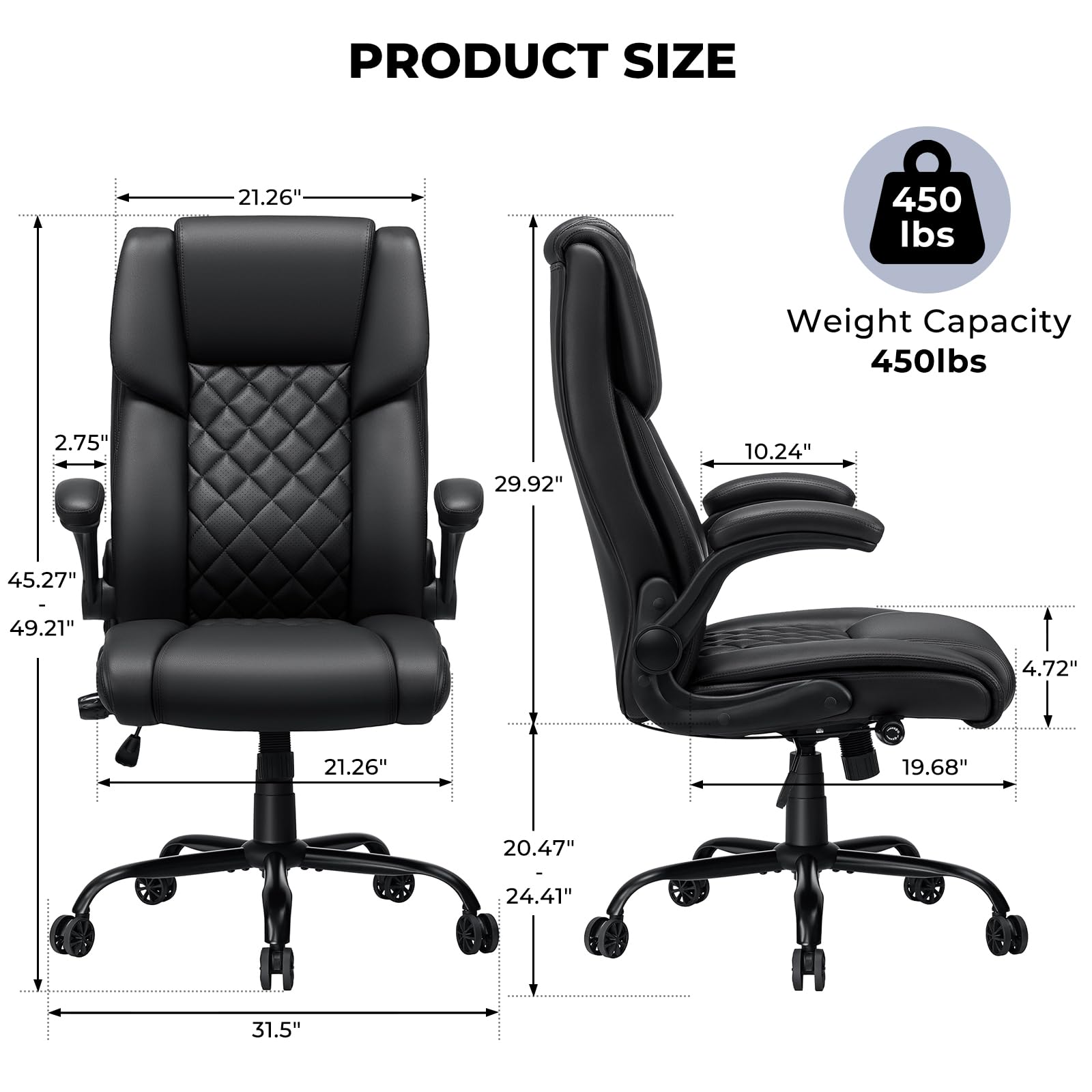 Big and Tall Office Chair 450lbs Heavy Duty Ergonomic Executive Desk Chair with Adjustable Lumbar Support High Back Home Computer Leather Chair with Padded Flip-up Arms for Heavy People Black
