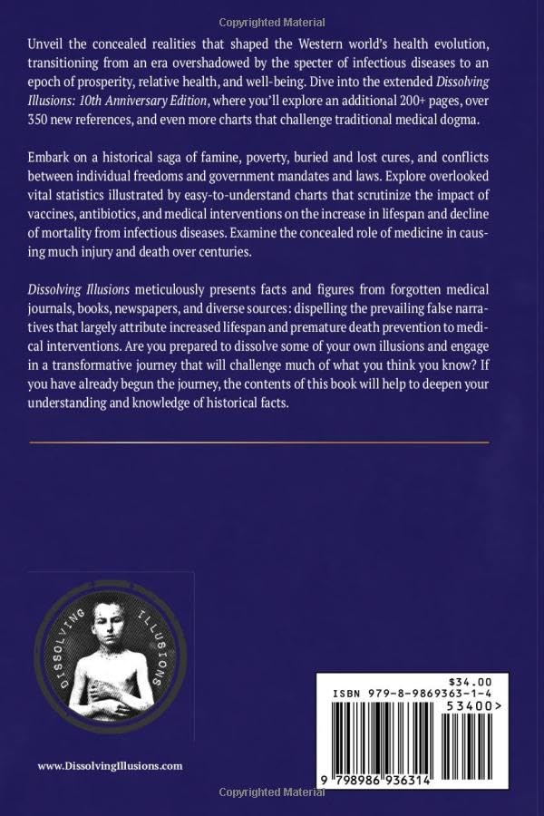 Dissolving Illusions meticulously presents facts and figures from forgotten medical journals, books, newspapers, and diverse sources: dispelling the prevailing false narratives that largely attribute increased lifespan and premature death prevention to medical interventions. Are you prepared to dissolve some of your own illusions and engage in a transformative journey that will challenge much of what you think you know? If you have already begun the journey, the contents of this book will help to deepen your understanding and knowledge of historical facts.