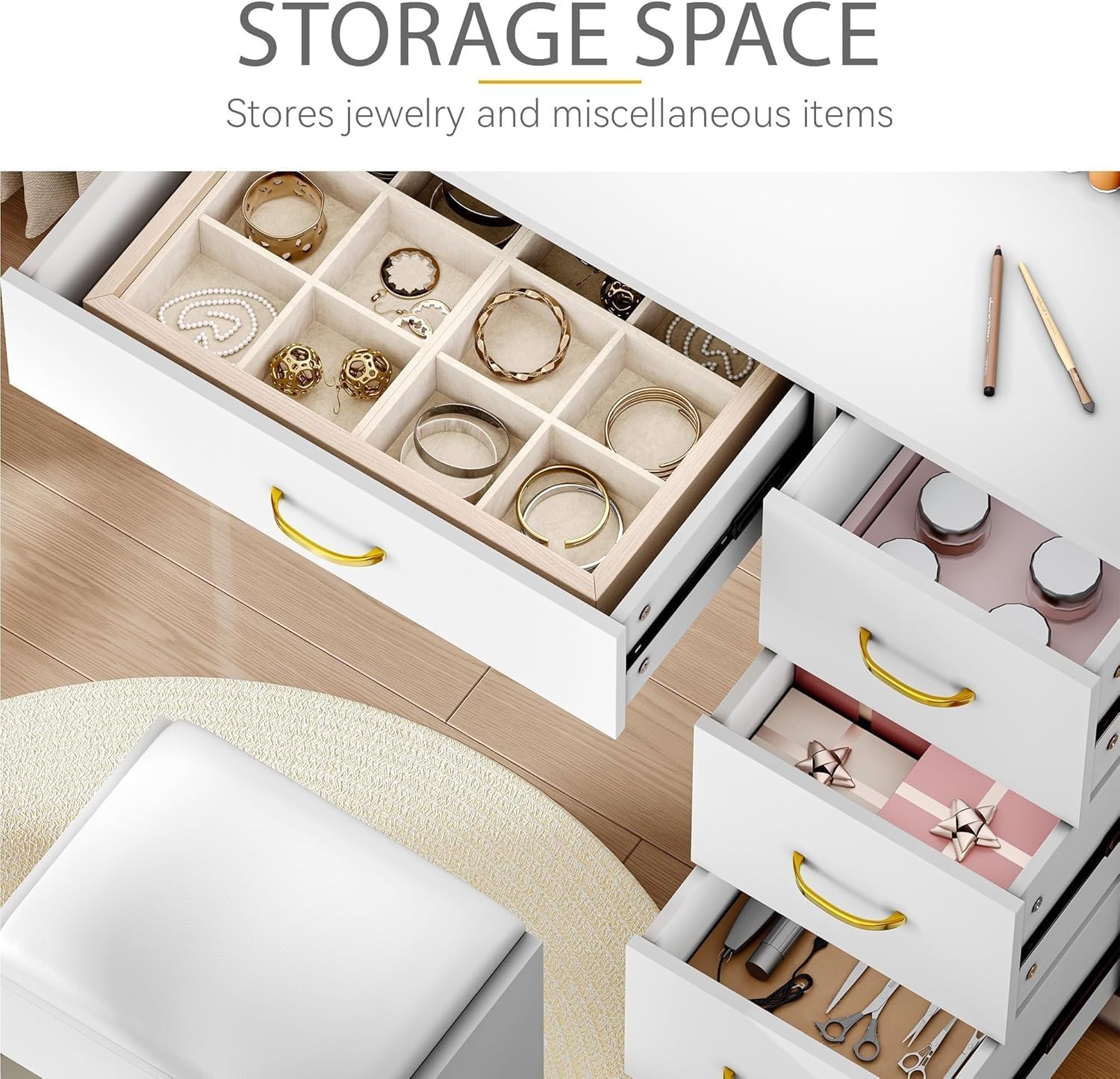 - AMPLE STORAGE SPACE: The 35.43"L x 15.74"W x 53.54"H vanity set provides exceptional storage with 4 large drawers. This versatile design accommodates an array of items, from cosmetics and perfumes to brushes, styling tools, and jewelry.