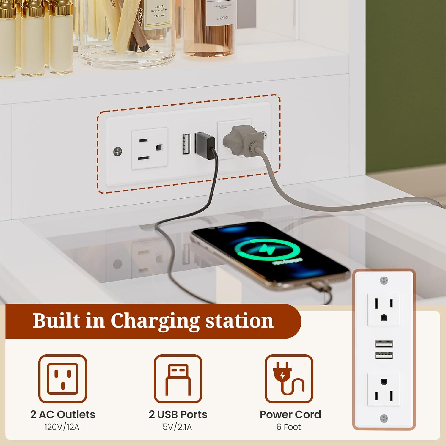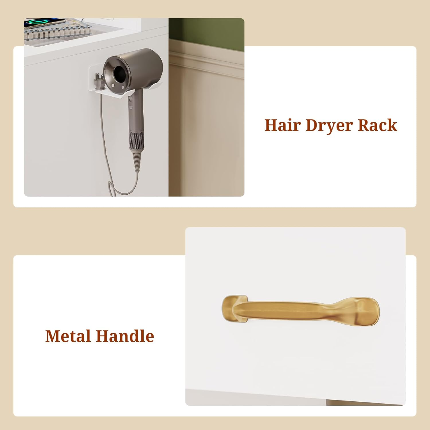 - Functional Features: Designed for user convenience, this versatile makeup desk includes a hair dryer rack and a charging station with 2 standard plug sockets and 2 USB ports, keeping your hair tools and mobile devices easily accessible