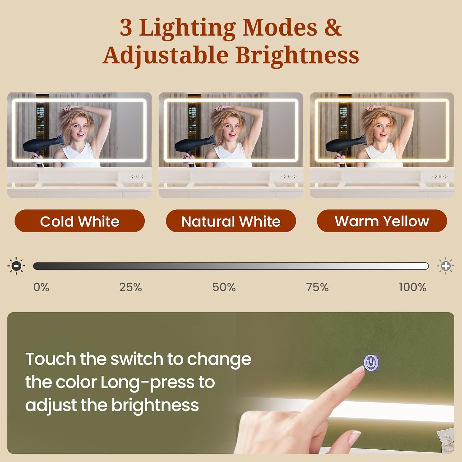 Makeup Vanity & Lighted Mirror, Vanity Desk with Power Strip, Adjustable Lighting, 7 Drawers, Dressing Room, Ivory
