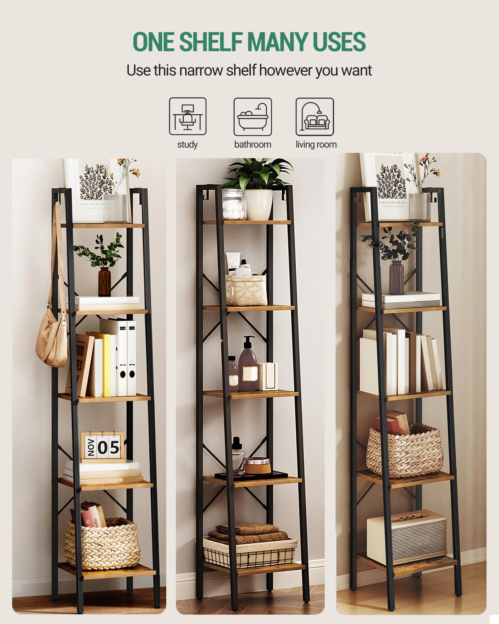 Ladder Shelf, Bookshelf Bookcase, Freestanding Corner Storage Shelve with 2 Hooks for Home Office, Living Room, Kitchen, Bedroom, Industrial, 5-Tier Rustic Brown BC03201B